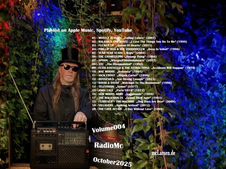 Berlin, 24.07.2025… RadioMcLarsen Vol.001 – Da das Ding ja etwas mit Radio zu tun hat, soll die Serie auch mit einem Lied über Radio starten: „Radio Free Europe“ ist ein in den USA gegründeter Sender, der besonders in Zeiten des Kalten Krieges von Bedeutung war… quasi ein bisschen Freiheit hinter den Eisernen Vorhang zu bringen. Nicht alles von dem Sender war erfolgreich, und in diesem Jahr wurde der Geldhahn von Trump zugedreht. Grund genug, eine alte Single von 1983 etwas aufzupäppeln… Es war schließlich die Debüt-Single einer damals komplett unbekannten, jungen Band aus Athens/Georgia, die im Laufe ihrer Karriere noch zu Weltruhm kommen sollte: R.E.M. Ich lernte die Band ein paar Jahre später kennen, und über viele Jahre waren sie eine meiner Lieblingsbands. Das erste Lied der RadioMcLarsen-Serie ist ein Remix dieser Single von 2025… nur gering abweichend vom Original. Als ich R.E.M. kennenlernte, galt die Band als eine Art amerikanisches U2… Da muss man wissen, dass jene U2 in den Mitte-1980ern meine absolute Lieblingsband waren. Damals dachte ich noch echt, dass Bono ein Samariter ist und mit der Musik die Welt retten wird… Nun ja… Nach „The Joshua Tree“ verflog der Zauber dann aber recht schnell. Wir hören den Song „A Sort Of Homecoming“ vom Album „The Unforgettable Fire“ in einer Liveversion… Ich bin normalerweise kein Freund von Liveversionen, diese hier macht den Song aber tatsächlich besser. Da der Sampler aber nicht nur ein Guide durch meine Musikhör-Geschichte werden soll, zappen wir 28 Jahre weiter und finden uns in Australien wieder bei dem Song „Endless Summer“ vom Debüt-Album der Band The Jezabels. Die Band um Sängerin Hayley Mary erreichte bei mir Platz 4 der Jahres-Albumcharts und den Sommerhit des Jahres 2012. Der Song fährt auf breiten Straßen und bietet hymnischen Dreampop. Das nächste große Ding wurden The Jezabels dann doch nicht, ihre beiden anderen Studioalben wollten nicht so sehr zünden, und seit 2016 ist Pause. Apropos Sommerhit… Mit dem „Liebesformular“ von International Music aus Essen kommt danach gleich der Sommerhit des vergangenen Jahres. Die Band, die auch als Düsseldorf Düsterboys unterwegs ist, ist für mich eine der coolsten deutschen Bands der Gegenwart. Das Trio verbindet verschiedene Musikstile und hat auch keine Berührungsängste mit Krautrock oder Progressive Rock. „Liebesformular“ ist einer der poppigen Momente der Band „Timeless Melancholy Music“, wie es im Text heißt. Zeitlos ist auch der nächste Song aus dem Jahr 1992: „Motorcycle Emptiness“ von den Manic Street Preachers ist kein bisschen gealtert, eine Hymne über Einsamkeit und Verzweiflung… Für mich nach wie vor der beste Song einer Band, die auch viele erfolgreichere Songs produziert hat. Zurück ins Jahr 1983, und es folgt ein Lieblingslied meinerseits, mindestens Top 5: „This Is The Day“ von The The. Es ist einer dieser Songs, bei denen ich nicht anders kann, als es laut zu drehen, wenn es im Radio kommt, und bei denen ich auch nicht anders kann, als laut mitzusingen… Das Lied strahlt einen bedingungslosen Optimismus aus, obwohl es eigentlich um etwas geht, was wir heute Prokrastination nennen. Um Matt Johnson, die Person hinter The The, war es jahrelang sehr ruhig. Letztes Jahr erschien ein gutes, altersweises neues Album, und neulich wurde eine komplett neue Version seines 1993er-Hits „Slow Emotion Replay“ veröffentlicht… die in dieser Version „This Is The Day“ gar nicht unähnlich ist. Der nächste Song hat auch ein paar Akkordium-Klänge und ist ebenso sehr euphorisch. Es ist „No Cars Go“ von Arcade Fire, vom zweiten Album „Neon Bible“, welches mein Album des Jahres 2007 war. Die Band war seinerzeit eine der besten der Welt für mich, live ein echtes Ereignis… Da rennen gefühlt 10 Leute quer über die Bühne und machen richtig Alarm, mit allen möglichen Instrumenten. Auf der Platte kam auch eine Kirchenorgel zum Einsatz… Nach „Neon Bible“ kam noch „The Suburbs“, ein Konzeptalbum, das nur noch halb so gut war. Danach wurden sie zu Tanzmäusen, Win Butler wurde unkorrekten sexuellen Verhaltens beschuldigt, und heute sind die Kanadier für mich nur noch eine stinknormale Band, die ihre besten Tage weit hinter sich hat… Schade… Das trifft auf The National nicht zu. Sie tauchten etwa gleichzeitig auf der Weltbühne auf und sind auch heute noch, mit 10 Studioalben im Gepäck, eine exzellente Band mit einer ebenfalls sehr lebendigen Live-Performance. Markenzeichen ist natürlich der Bariton von Matt Berninger, der auch gerade ein nicht minder gutes Solo-Album veröffentlicht hat. Das Album „High Violet“ war übrigens mein Album des Jahres 2010, und „Lemonworld“ ist mindestens so gut wie der Hit „Bloodbuzz Ohio“ vom gleichen Album. Es geht dann auch etwas ruhiger weiter… zumindest erstmal. Beach House, das amerikanisch-französische Duo, war mit die ersten, die eine Renaissance von Dreampop und Shoegaze ermöglichten. „Dive“ aus dem Album „7“ fängt erst verträumt an, man fühlt sich wie so oft bei der Band in Watte gehüllt… Dann nimmt der Song aber noch etwas Tempo auf, und es kommen laute Gitarren zum Einsatz. Es wabert wunderbar vor sich hin, bis das Lied dann plötzlich zu Ende ist. Dreampop wurde jedoch viel früher erfunden, und eine der Pionierinnen waren auf jeden Fall Siouxsie & The Banshees. Nach ihrer frühen Punk-Phase und Highlights der Rubrik Goth-Rock kam die Band ab Mitte der 1980er in poppigere Gefilde, ohne ihre Musik nennenswert zu verändern. „Song From The End Of The World“ ist eine Standalone-Single von 1987, sicher nicht ihr größter Hit, für mich jedoch einer ihrer besten. Die nächste Band ist Type O Negative, eine amerikanische Metalband, die ursprünglich im Bereich Doom- und Goth-Metal zuhause war. Heavy Metal war für mich immer nur bedingt interessant, es gab und gibt zu viele Spielweisen dieses Genres, mi
