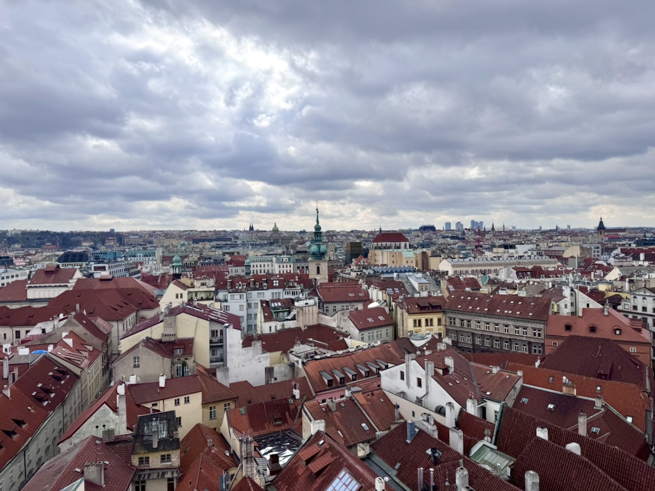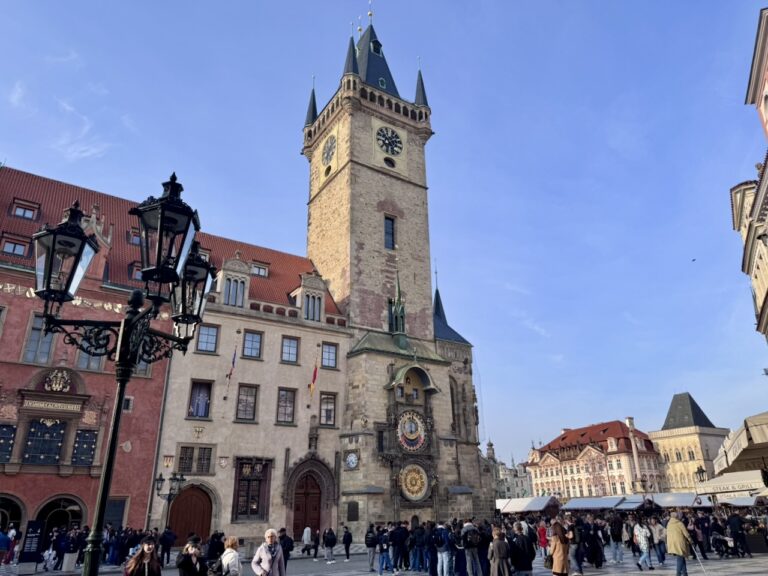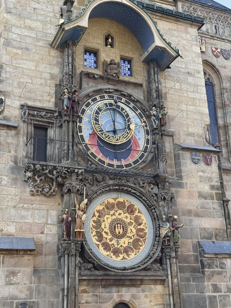Vorbei am Rudolfinum, einem prächtigen Konzerthaus und Sitz der Prager Philharmonie, liefen wir an der Moldau in Richtung Karlsbrücke, bogen dann in die Innenstadt ein und steuerten das Altstädter Rathaus und besonders dessen Astronomische Uhr an… es war kurz vor 11 Uhr. Ich nutzte die Tatsache, dass alle die Uhr sehen wollten, und kaufte mir ein Ticket, um die Sache mal von oben zu betrachten. Eigentlich dachte ich ja an Treppensteigen auf alten, abgelatschten Stufen aus dem Mittelalter… aber siehe da… Aufzug! Der Ausblick konnte sich sehen lassen, dass ein kalter Wind mir fast die Mütze vom Kopf geblasen hätte, ist auf den entstandenen Fotos nicht zu sehen.