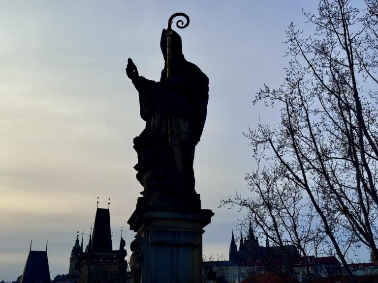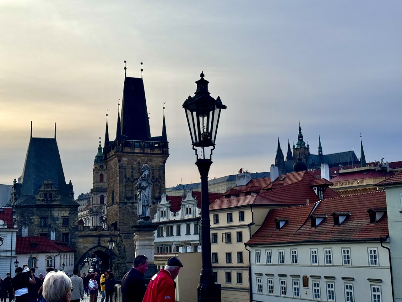 Die Brücke über die Moldau wurde im 14. Jahrhundert errichtet… Vorbild war die steinerne Brücke von Regensburg, für die Bauausführung und besonders für die Türme an beiden Enden wirkte der Architekt Peter Parler… der Prager Stararchitekt seiner Zeit. Die Brücke ist 510 Meter lang und 10 Meter breit und heißt erst seit 1870 Karlsbrücke… benannt nach dem Bauherrn Karl IV. (1316–1378)… eine Statue von Karl findet man auf der Brücke nicht (wir suchten danach)… aber die Statuen stammen alle aus der Barockzeit und stellen ausschließlich christliche Würdenträger dar.