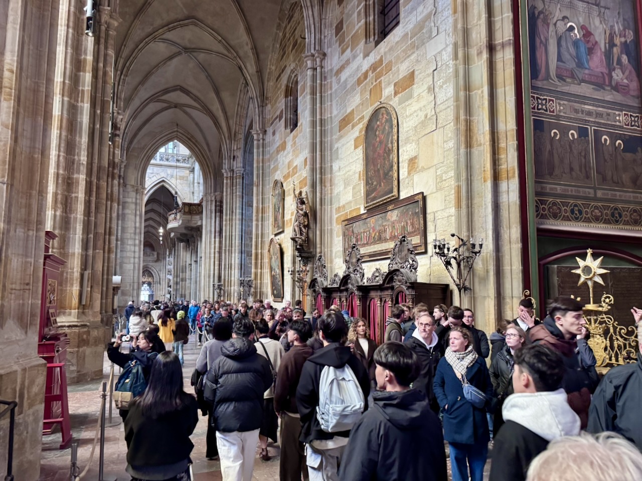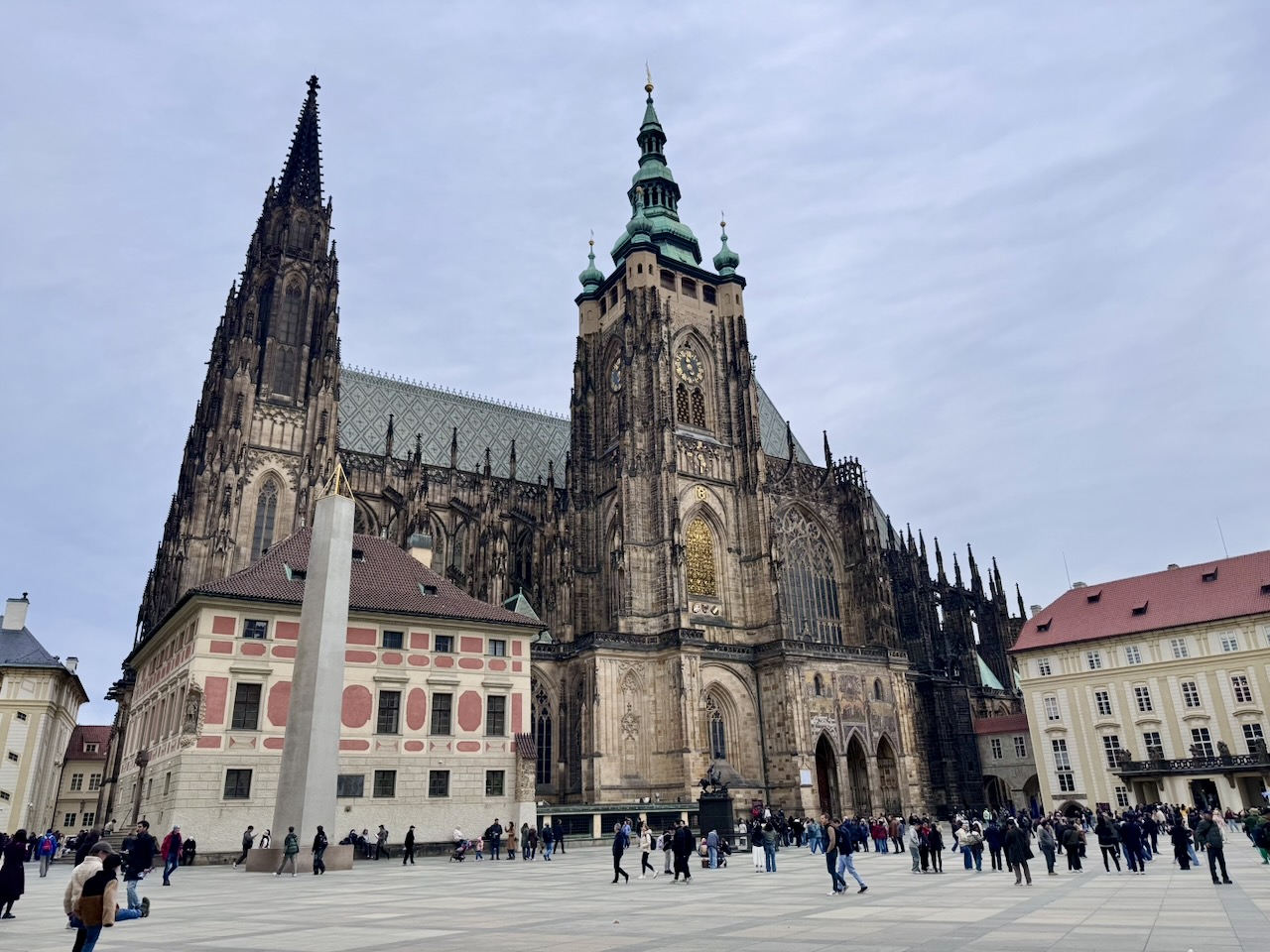 Das Herzstück des Areals ist der gewaltige Veitsdom… eine gotische Kathedrale, deren Bau im 14. Jahrhundert unter Kaiser Karl IV. begann. Hier wurden die böhmischen Könige gekrönt… hier liegen viele von ihnen auch begraben… und über allem ragt der große Südturm, der das Panorama der Stadt prägt.