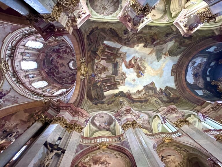 Als wir wieder unten waren, liefen wir ein wenig durch die Kleinseite, so heißt der Stadtbezirk unterhalb des Burgberges. Gegenüber der Kirche St. Nikolaus auf der Kleinseite kehrten wir dann erstmal zum Mittagessen ins U Glaubiců ein. Wir hatten Glück mit dem Platz, als wir dann später wieder gingen, war kein einziger Platz mehr frei, weder innen noch außen. Unser nächstes Objekt war dann die bereits erwähnte St.-Nikolaus-Kirche. Da dieser Bau im Schatten der gigantischen Burg steht und auch ringsum in dichter Bebauung liegt, merkt man erstmal gar nicht, wie groß die Kirche ist. Mit ihrer Kuppel und dem Glockenturm prägt sie durchaus schon das Bild der Kleinseite, die wahre Größe erfährt man dann, wenn man die Kirche betritt. St. Nikolaus zählt zu den bedeutendsten barocken Kirchengebäuden der Welt. Das Deckenfresko „Verherrlichung des heiligen Nikolaus“ zählt mit einer Fläche von 1500 Quadratmetern zu den größten Werken Europas, die mit Farbe und Pinsel erschaffen wurden… mächtig gewaltig und reichlich Lametta.