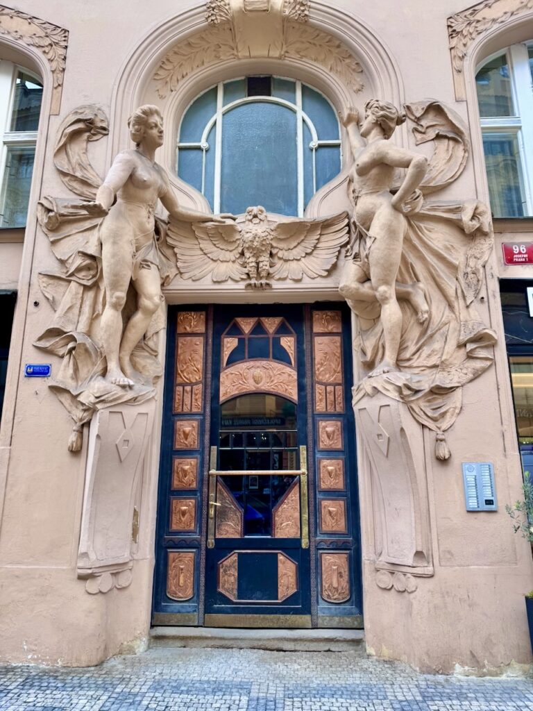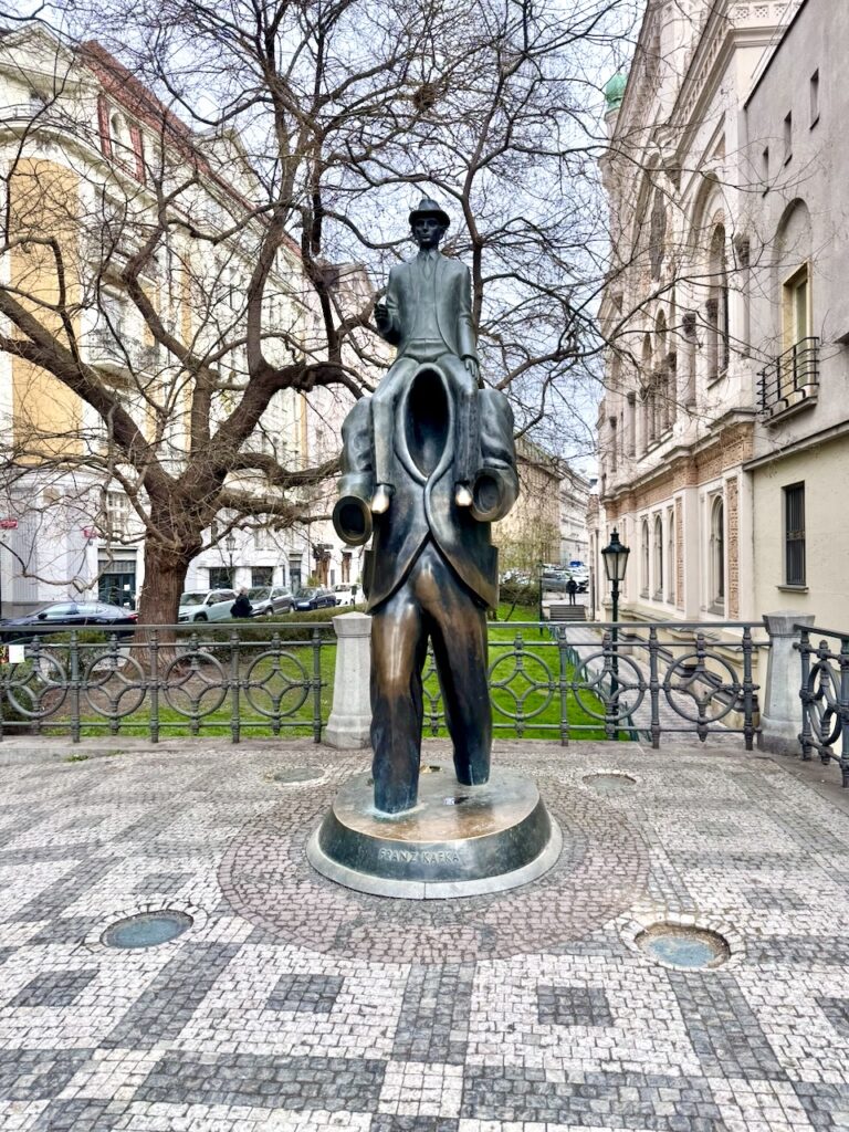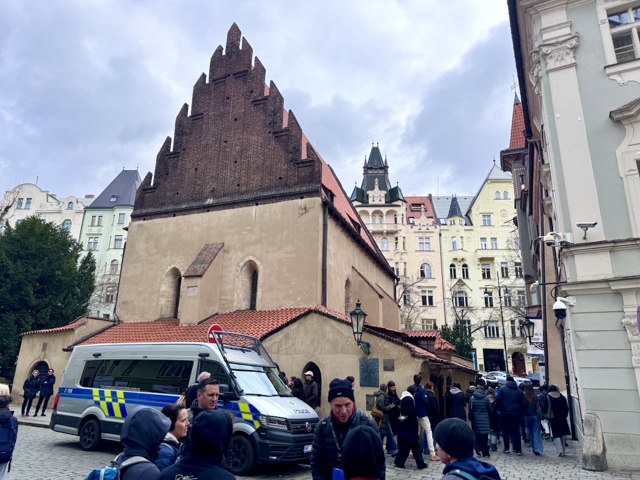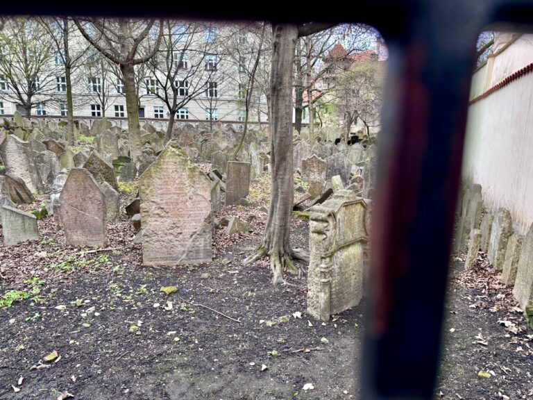 Der dritte Tag war nicht im Voraus verplant, sondern offen für alles, was noch von Interesse ist. Wir fuhren mit der Tram zur Haltestelle Dlouhá třída, die in der Nähe von Josefov, dem alten jüdischen Viertel, liegt. Die jüdische Kultur hatte in Prag große Bedeutung. In dem Viertel sind viele Spuren dieser Zeit noch sichtbar. Die ursprüngliche Bebauung musste Ende des 19. bis Anfang des 20. Jahrhunderts moderneren Gründerzeitbauten weichen. Übrig blieben einige Synagogen, das Jüdische Rathaus und der Jüdische Friedhof. Dass diese Bauwerke auch die Zeit des Nationalsozialismus überlebt haben, ist ausgerechnet Adolf Hitler zu verdanken… der wollte nämlich aus dem Areal ein Museum für eine ausgerottete Rasse machen… kann man sich nicht ausdenken. Nichtsdestotrotz sind die Gebäude heute auch Museum, nämlich das Jüdische Museum. Wir hatten keine Besichtigung geplant, und es war auch bereits am Vormittag ein großes Gewimmel von Schulklassen aus aller Welt. Leider konnte man den berühmten alten jüdischen Friedhof nur im Zusammenhang mit einem Museumsbesuch besichtigen, und ich fand auch nur eine kleine Öffnung in der Mauer, durch die man ein paar Quadratmeter sehen konnte.